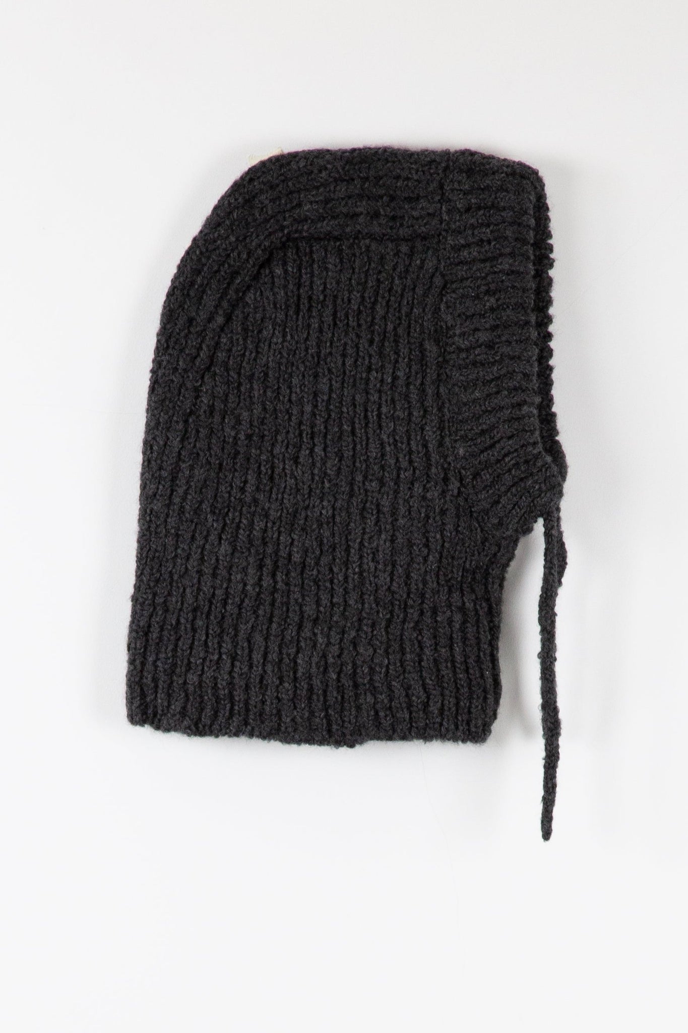 Oversized hand knitted balaclava, to be worn like a big hoodie. It is looser in fit in comparison to the Bruna Balaclava, comes with a draw string and is made out of our new very soft irregular yarn 70% organic wool 30% superfine Alpaca, knitted by a women's cooperative in Kent, we have worked with since 10 years.