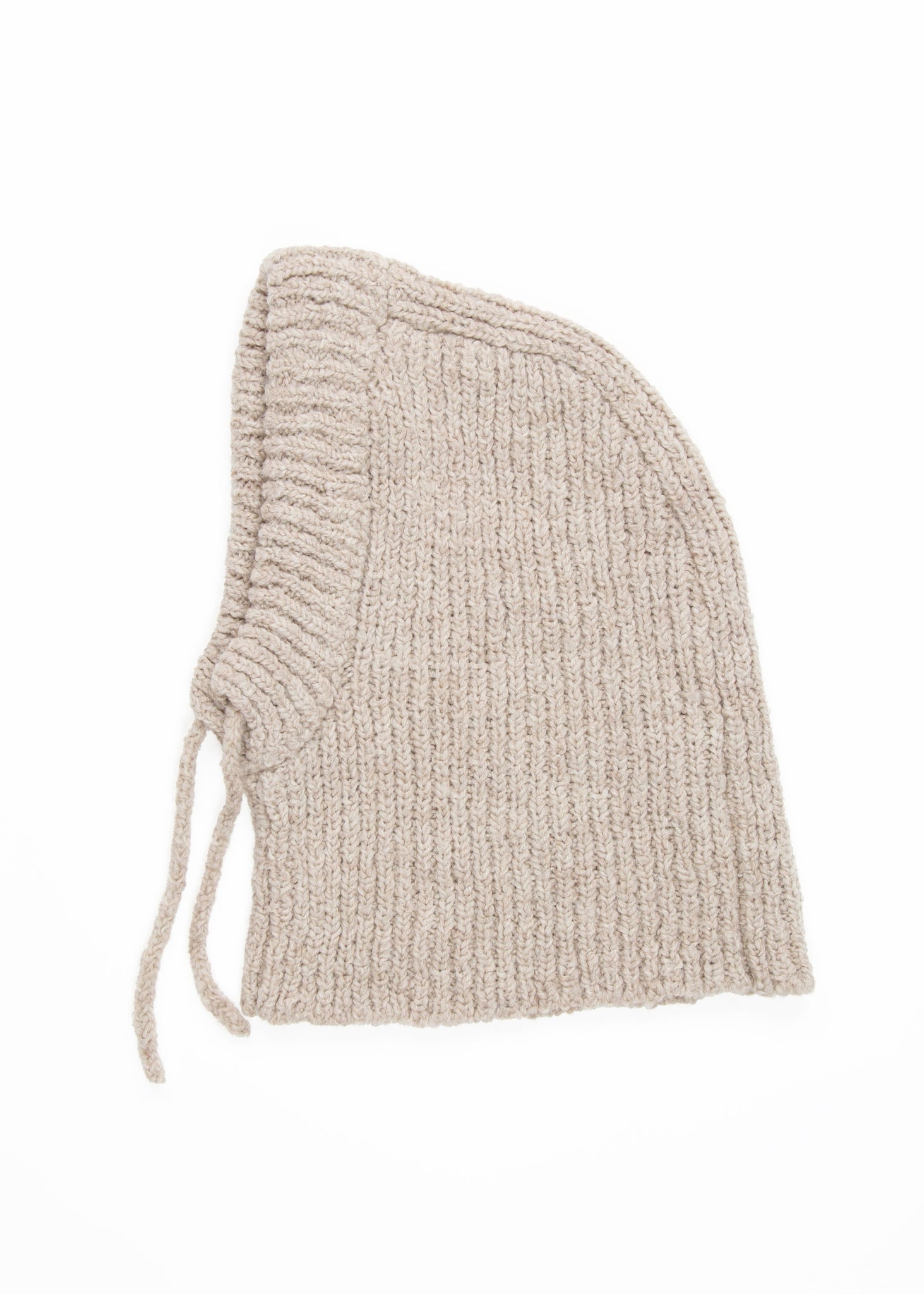 Oversized hand knitted balaclava, to be worn like a big hoodie. It is looser in fit in comparison to the Bruna Balaclava, comes with a draw string and is made out of our new very soft irregular yarn 70% organic wool 30% superfine Alpaca, knitted by a women's cooperative in Kent, we have worked with since 10 years.
