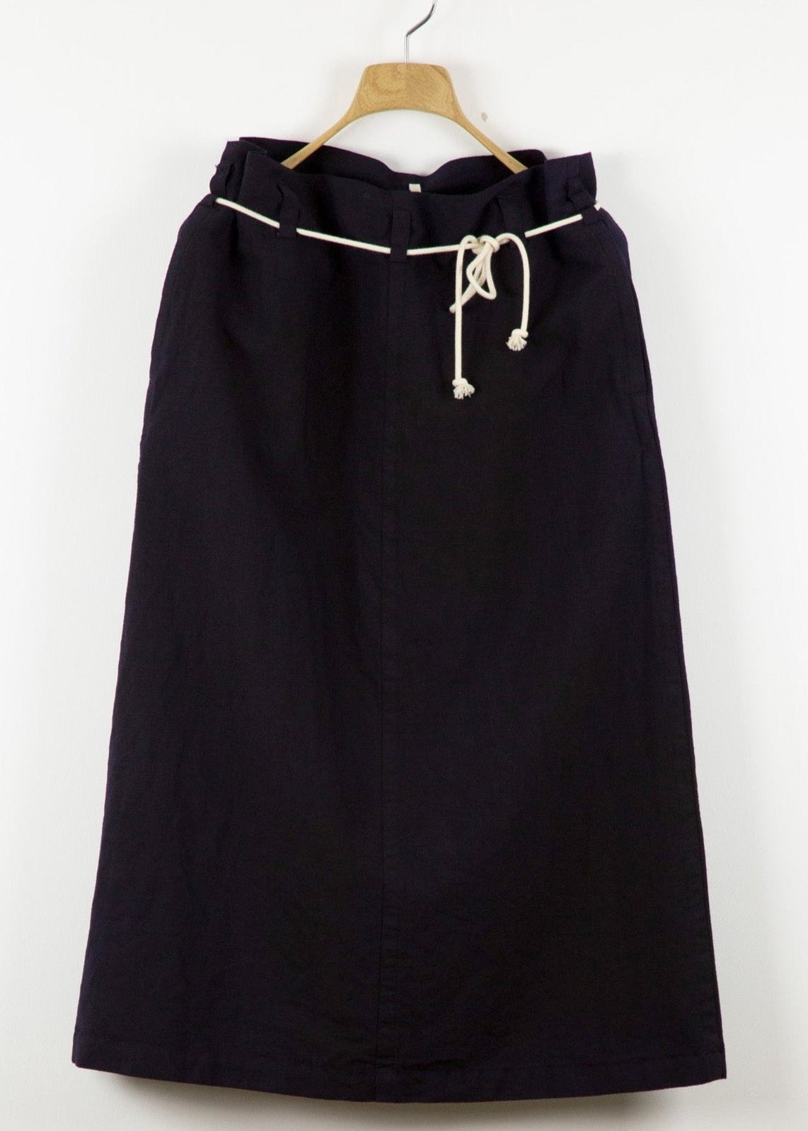 Long, twin belt loop skirt with curved side seam silhouette Designed to be hoisted and tied with a belt or drawstring, pockets in side seam.