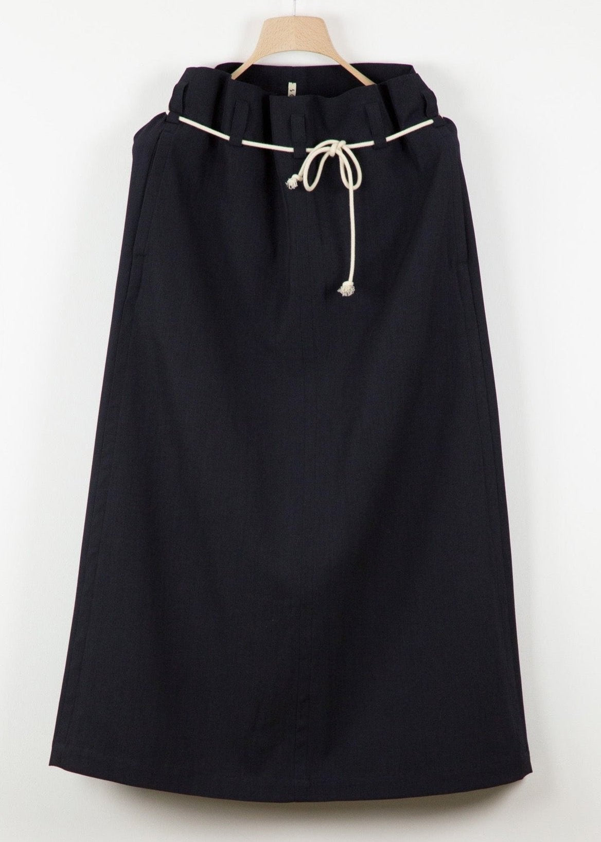 Long, twin belt loop skirt with curved side seam silhouette Designed to be hoisted and tied with a belt or drawstring, pockets in side seam.