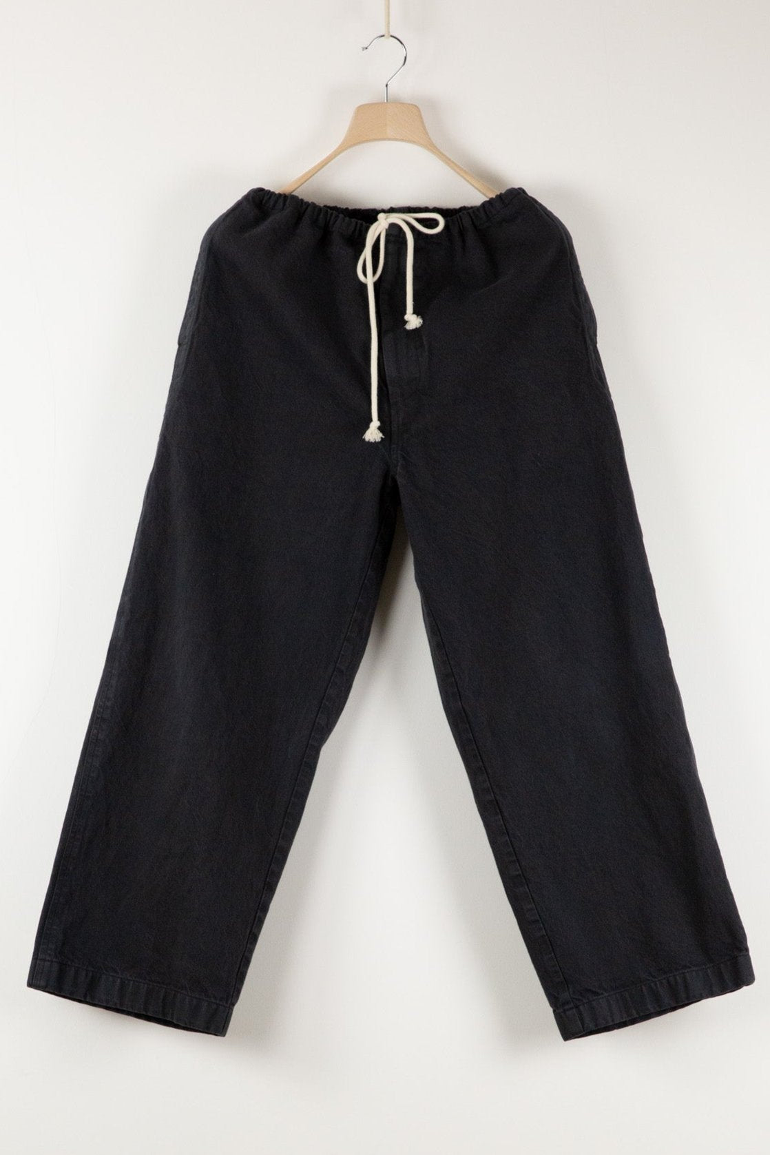 Super oversized drawstring trousers with wide straight leg, long rise, pockets in side seam and a practical large back pocket.