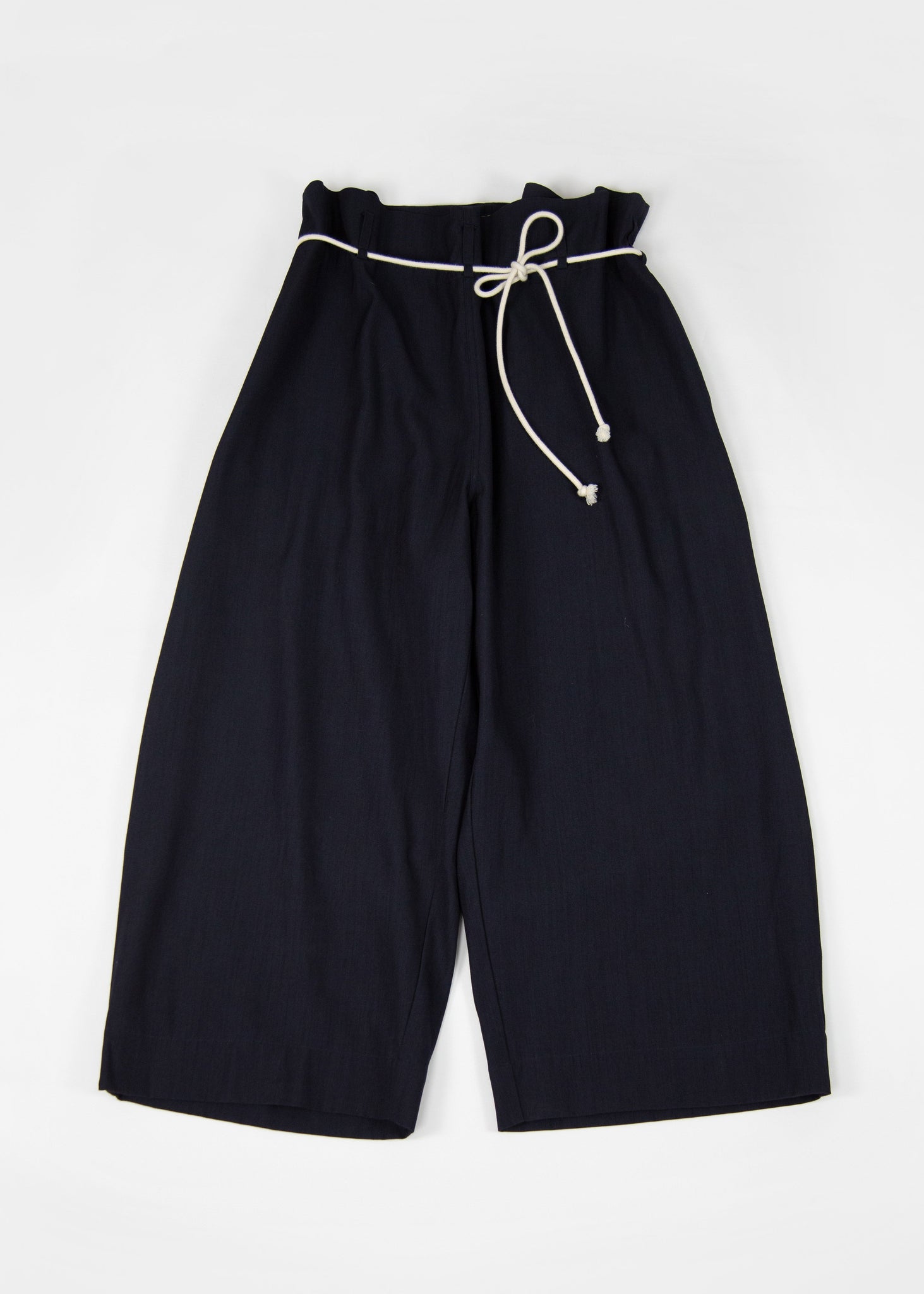 Loose twin belt loop trouser with curved side seam silhouette and cropped wide leg. Designed to be hoisted and tied with a belt or drawstring, pockets in side seam.