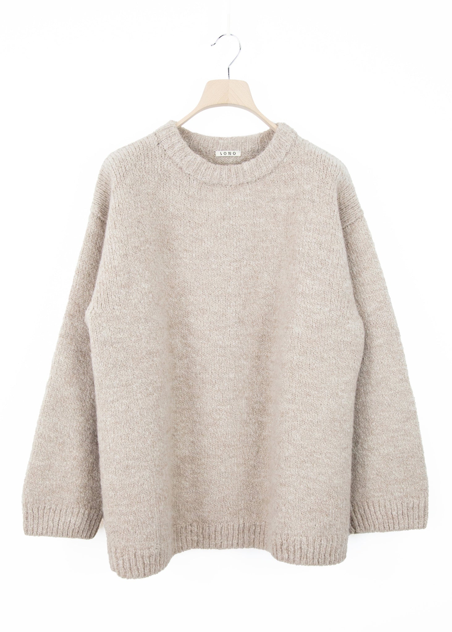 Oversized, grungy but super soft jumper with wide neck, irregular hem and cuff tension, in new irregular yarn 70% organic wool 30% superfine Alpaca (has a lighter garment weight than MOS), knitted by hand operated knitting machines, linked together by hand, made by a women's cooperative in Kent, we have worked with since 10 years.